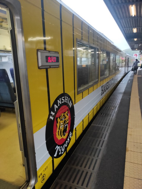 安芸駅では反対ホームに5分で接続する二両の快速列車が待っており、こちらは転換クロスシートでだいぶ混雑しています。塗装は阪神タイガース仕様で二軍やキャンプの時に使う縁もあるのでしょう。