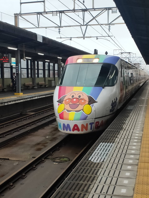 あまり海は見られませんが遠くにチラチラと眺めたりしながら走り、途中の伊予北条でも乗車がありながら松山に定刻通り到着。アナウンスはアンパンマンの声優さんによる自動音声、チャイムもアンパンマンのマーチが使われています。