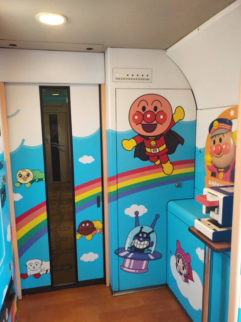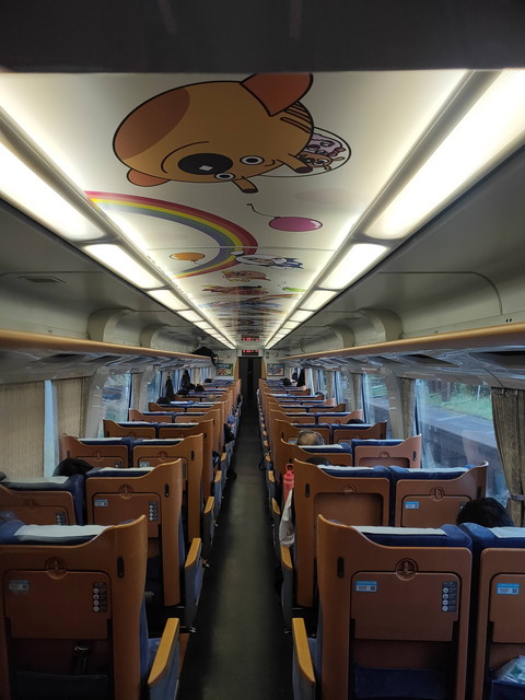 乗った2号車は天井がアンパンマン仕様になっています。普段は指定席で使われるので座席も木目調と心なしか乗り心地が後ろの3~5号車に比べると良い感じです。