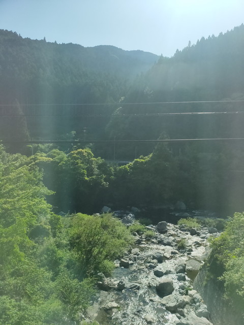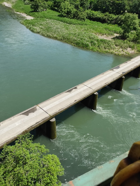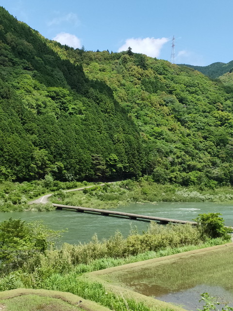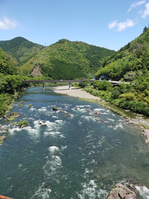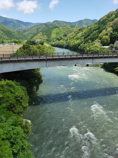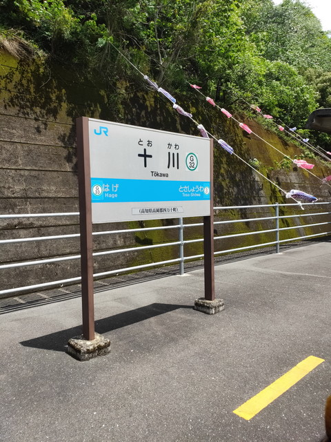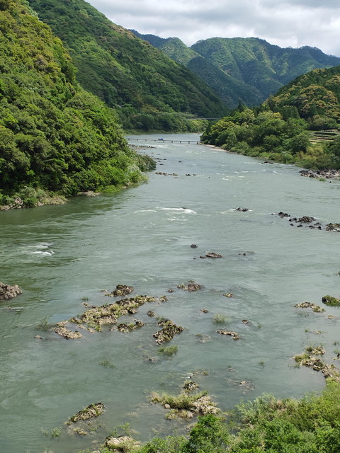 その先では激しく蛇行する四万十川がΩ型になっているところを見ながら(写真では入り切らない)、先週まで川に300ほどの鯉のぼりを渡していた十川を過ぎ、川遊び公園を下に見ながら土佐昭和駅へと進みます。この間にも幾つかの沈下橋が見られるので、右左に移動しながら写真を撮り、土佐大正駅に到着すると再び一般車両に戻ります。