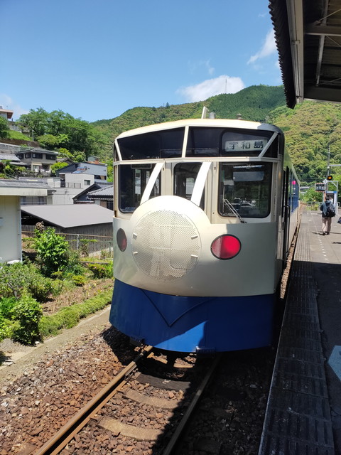 土佐大正駅では反対列車と行き違いを行いますが、新幹線を模したユニークな車両でした。