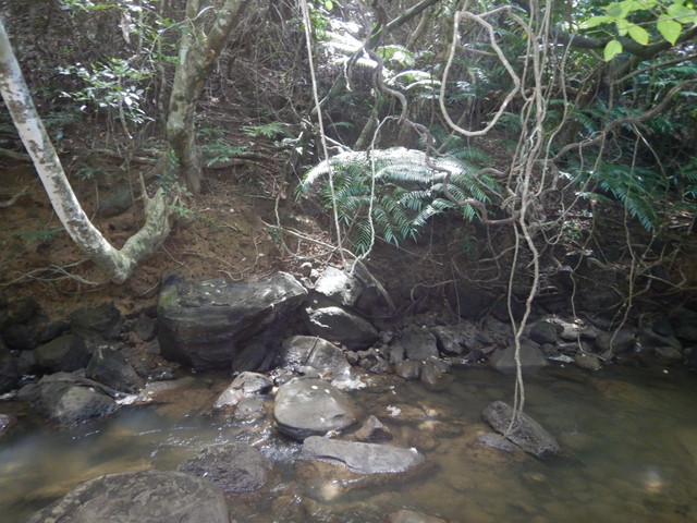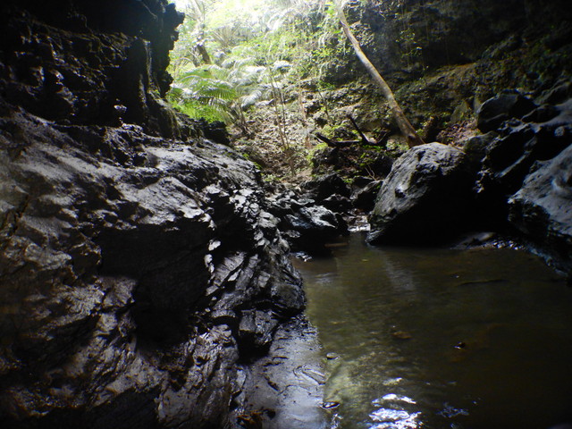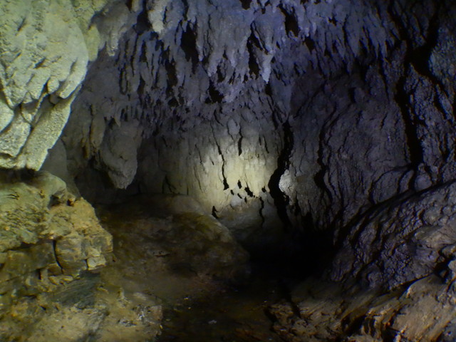 緑のすき間から陽射しも入るので圧迫感はないものの、鍾乳洞の中に入ってヘッドライトを消すと、ホントに真っ暗でいつまでたっても目が慣れてきません。こうなるとせせらぎの音さえ恐怖に感じます。