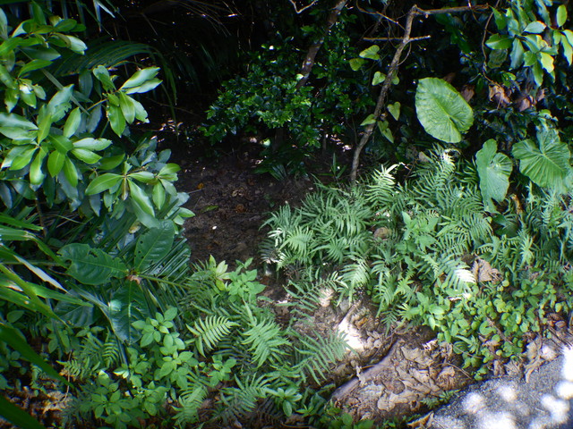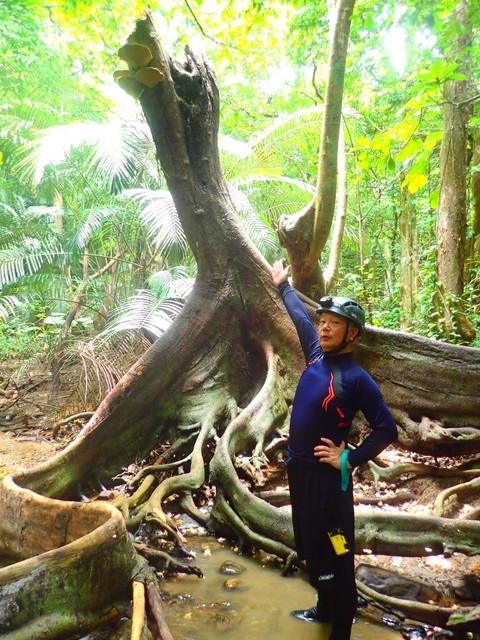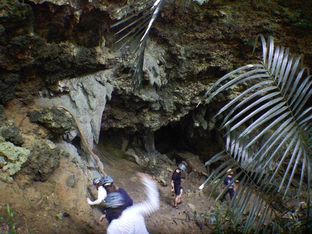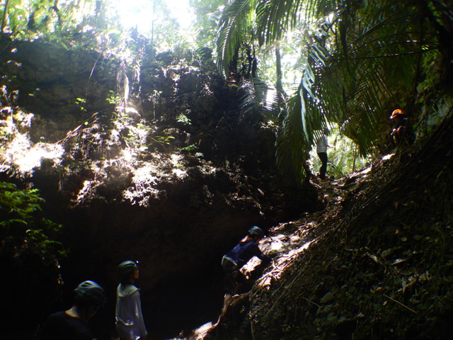 といっても、看板があるわけでもなし。どこだ?と思ったら道の脇にあるちょっとした草を刈った程度のすき間が入口です。ヘルメットにヘッドライトを装着して歩いていきますが、最初はジャングルの中を歩くようです。
