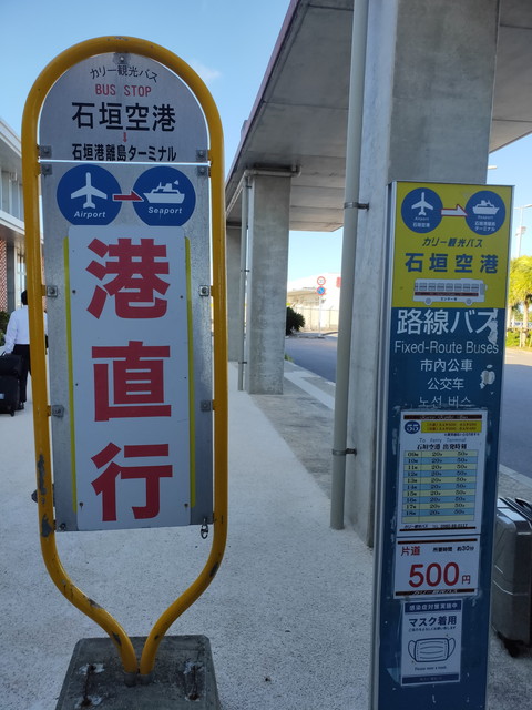 17:00発のカリーバス、石垣空港直行バスがちょうど出るところで、運転士さんが急いで!と手招きしています。運賃500円を前払い(現金)で支払って乗り込みます。