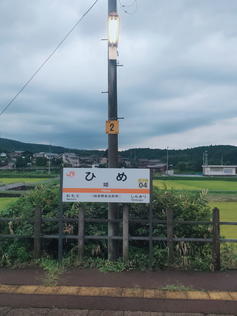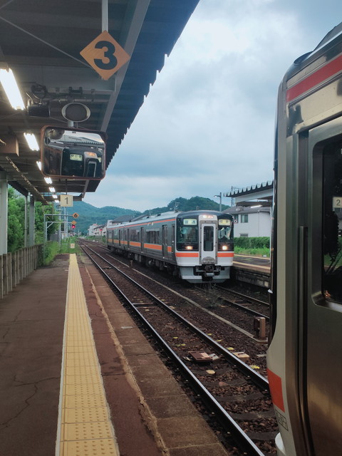 途中の鵜沼駅で5分停車して反対列車と行き違いをし、さらに次の坂祝駅では大阪行きを連結した特急ひだと行き違いのために6分停車とのんびり運転です。美濃太田に着いても5分ほど停車でした。