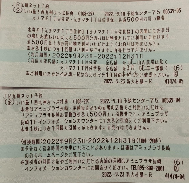 意外に見落としなのですが、このきっぷには2つの500円分お買い物クーポンが付いています。