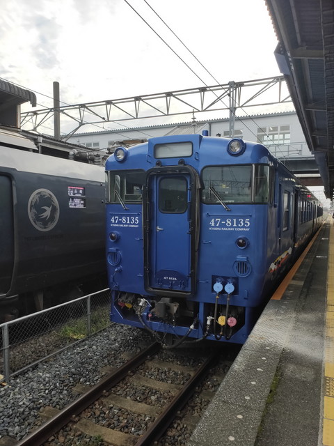 階段を渡っていくと青一色の車体が待っていました。よく見れば中は何の変哲もないキハ47の2両で、鉄道ファンらしき人が乗っているくらいで窓側座席を確保できるレベルでした。