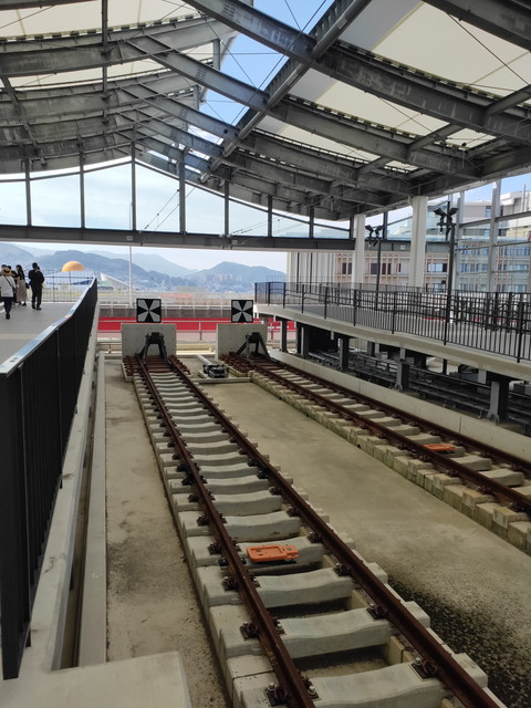 駅を下りて先端部まで歩いていくと車止めがあり、その先には海や港を遠望できる場所があります。