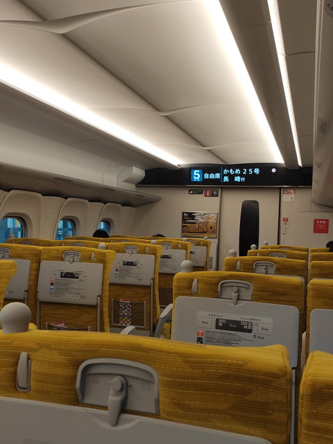 気づいたのは新大村駅で下車する人が案外多かったです。この理由は開業当日のお試し乗車が多かったこともありますが、長崎~新大村は唯一2駅乗車しても自由席料金が870円と安いこともいえるでしょう。そのためか、4号車の窓側席を確保することができました。全体を見ても乗車率は8割くらいでその気になれば十分座れます。