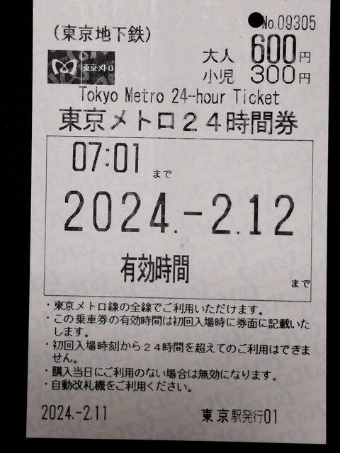 購入してから日をまたいでの24時間利用可能な東京メトロ24時間券を購入。600円なので、4回乗車すればモトが取れます。