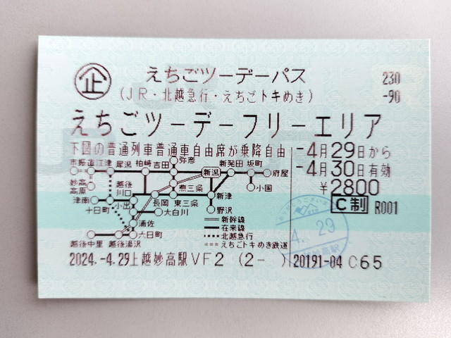 違いは有効期間の他、利用可能エリアにも差があるので、今回は1日しか使わないのですが2日用のえちごツーデーパスを購入しました。