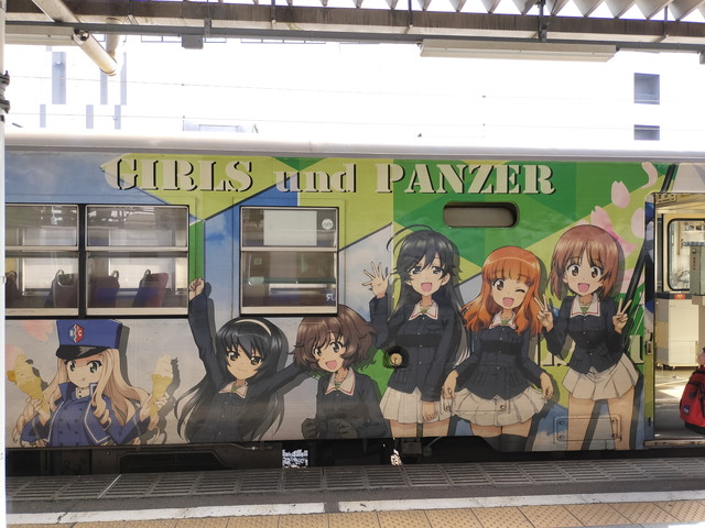 ガールズアンドパンツァーのラッピングがされた6000系の18号機を連結した2両編成に乗車。鹿島サッカースタジアムに向かうサポーターが多く乗っていたので混雑していました。