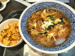 ちょうどお昼時になったので駅構内を歩いてみますが、めぼしいところがなかったので、駅ビルエクセルのレストラン街に入って中華のセットを食べました。