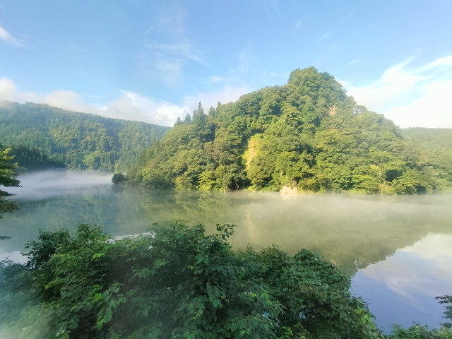 早戸までの間に第三只見川橋梁を渡りますが、むしろ早戸駅近くにある霧幻峡の渡しあたりの眺めが秀逸で、名前の通り霧が多く発生していて、車も多く停まっており、列車を入れて撮影している人が沢山見られました。
