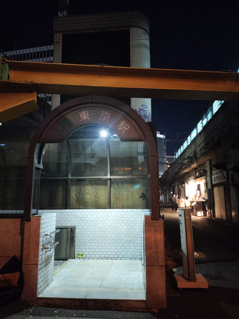 いわゆる飲食街が連なっており、そこを抜けると右側に小さな階段の出入口があり、ここを降りていくと京葉線の地下八重洲口に出ます。こちらは丸ノ内側よりも時間がかかる感じで10分少々かかりました。