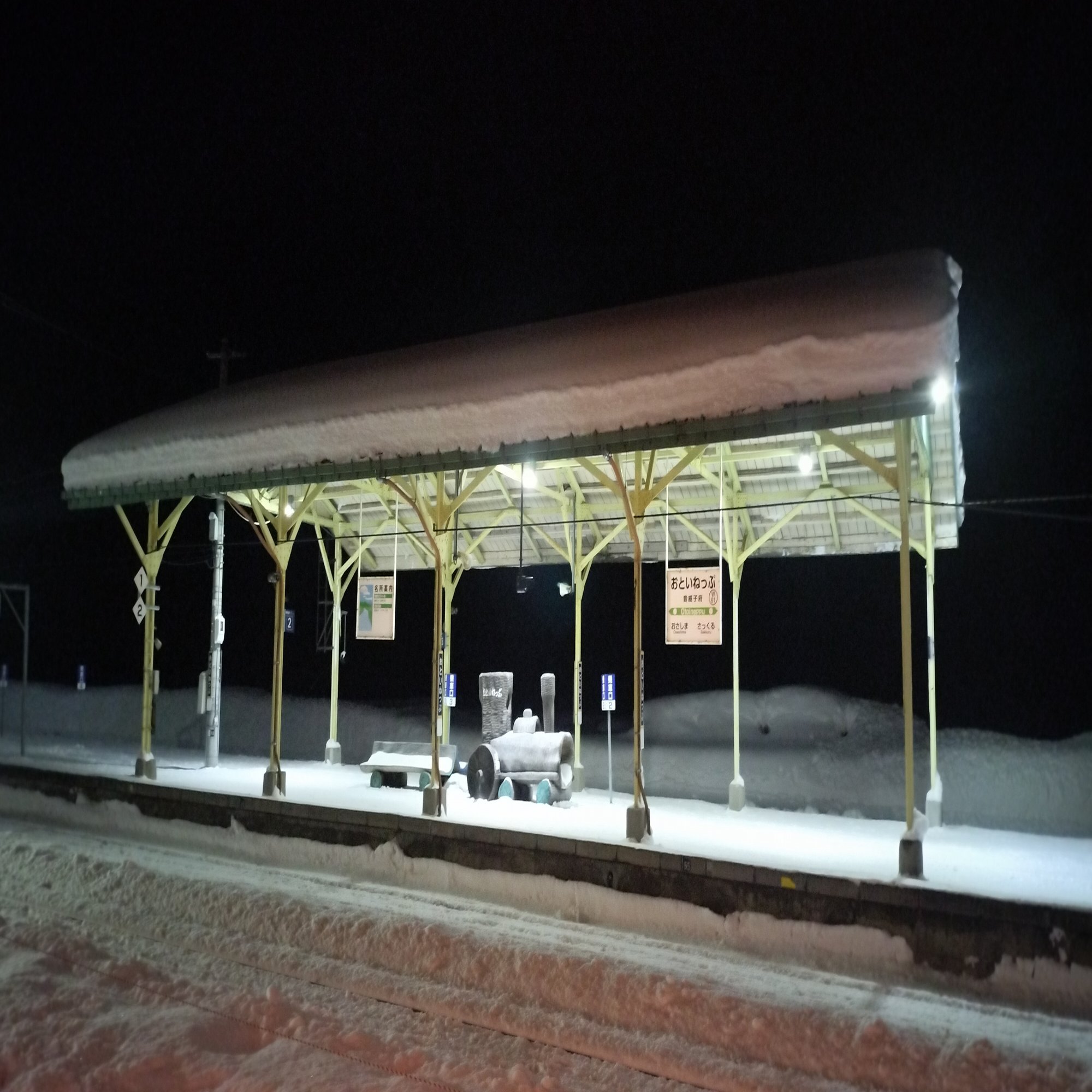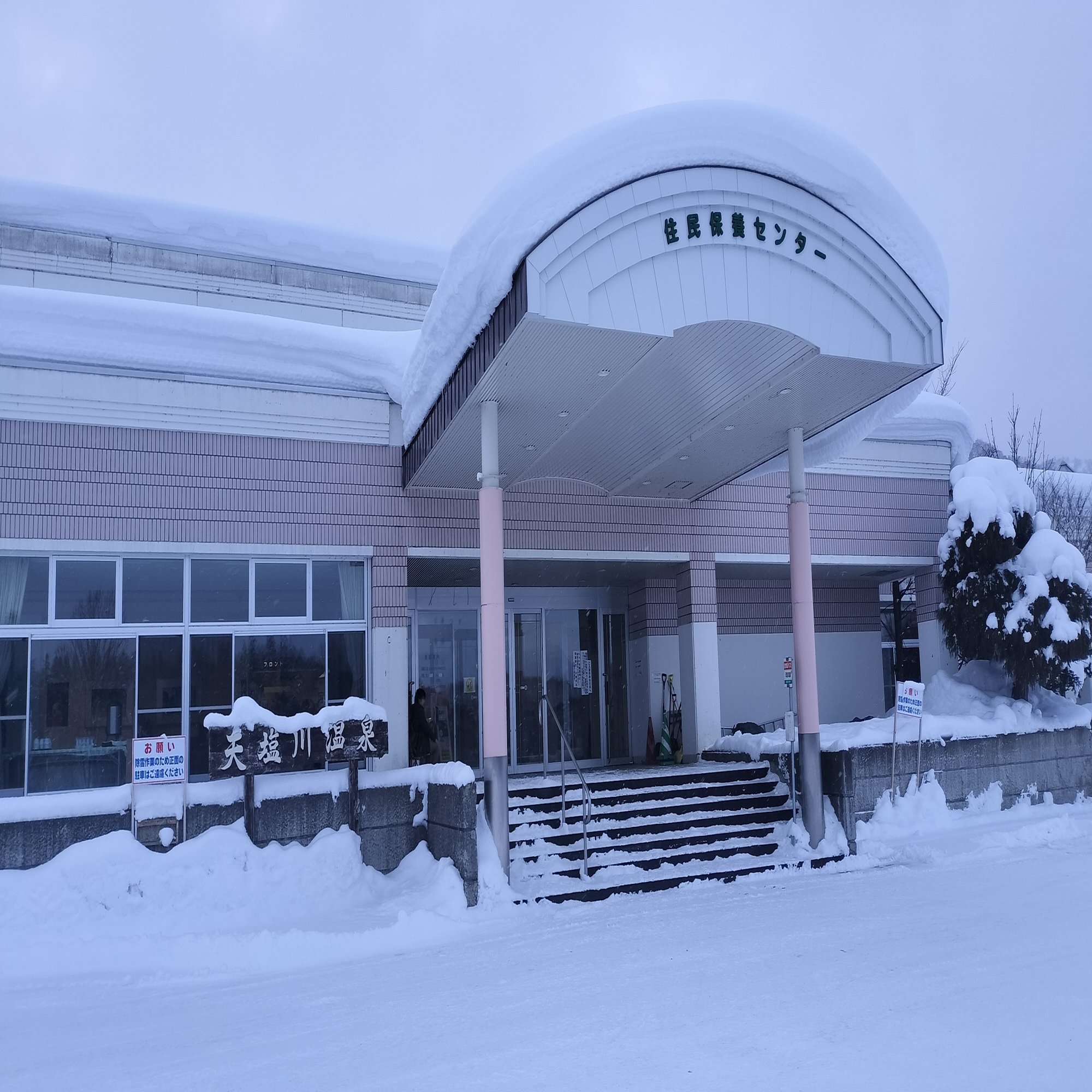 途中シカが現れて急停車しましたが、幸いにも接触はなかったので、わずかな遅延で天塩川温泉に到着。もう1人降りた人がいます。